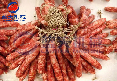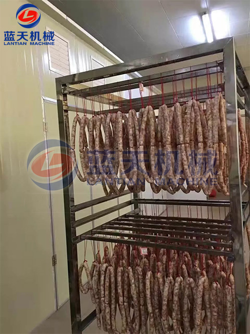 2、減速干燥階段。發(fā)色期和收縮定型期的控制,溫度控制在52℃~54℃,濕度控制在45%左右、時(shí)間為3到4個(gè)小時(shí),臘腸逐漸從淺紅色轉(zhuǎn)為鮮紅色,腸衣開(kāi)始收縮,這時(shí)一定要注意硬殼的出現(xiàn),可以進(jìn)行冷熱交替使用,效果更好。