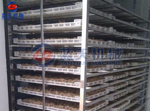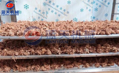 2:先將采收的文山三七挑選裝盤,使用不銹鋼托盤、合理均勻將三七擺放至托盤架中,每層間隔約為10厘米至15厘米,不宜鋪放太多,擺放以通風透氣為佳,這樣每一層三七都能均勻受熱、干燥脫水。