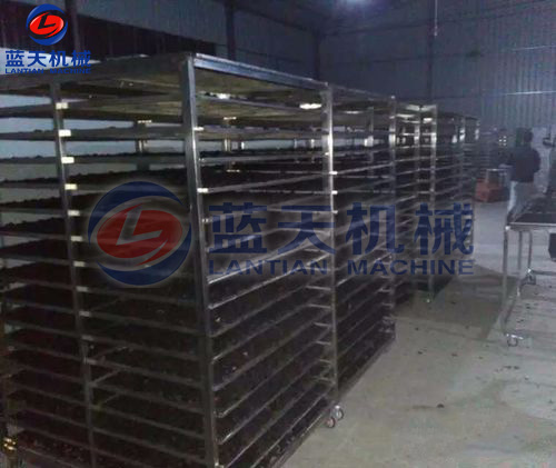 桑葚裝盤:使用桑葚烘干機干燥處理,時間要18個小時就可以干燥處理完了。一般每4公斤鮮桑葚可制成1公斤桑葚干。將經整理去雜后的桑葚裝篩子,裝入物料車內。每臺物料車不宜超過14個篩子,篩子層間距控制在10公分左右。以10P機為例,不要超過10臺物料車,以保證烘干房內有合理間隙位,利于熱風通過。