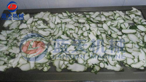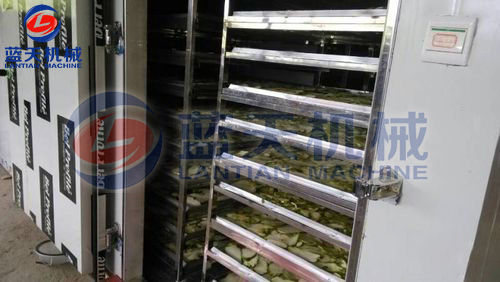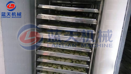 將切片好的佛手片放置于物料車托盤,注意堆放厚度不要超過3CM,這樣有助于烘房?jī)?nèi)平流風(fēng)對(duì)整個(gè)物料的烘干效果保持一致性。