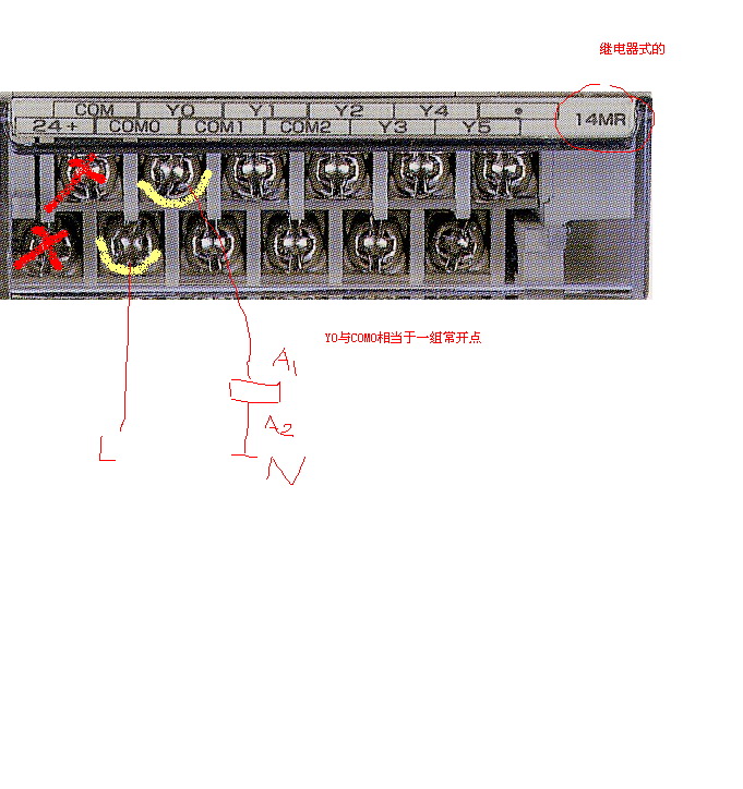 是我沒有說清楚 ,圖中的紅叉不算。那兩個黃色標記的是輸出端的COM0,另一個是Y0。如果要用這兩個端子控制一電磁繼電器你會怎么接線?
