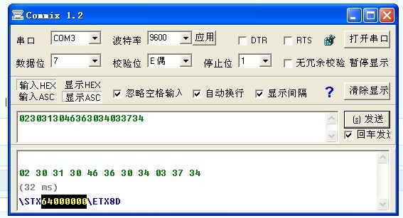 好吧在完全不懂的情況下我自己摸索出來了 哈哈今天總算是把數(shù)據(jù)讀出來了 我在網(wǎng)上下了個(gè)樣例程序就是樓上的結(jié)果plc沒有返回 我又不懂調(diào)試vb這樣的程序 后來我想到一個(gè)解密用的串口工具 把讀取d123 開始的4位數(shù)據(jù)寄存器數(shù)據(jù) 指令格式是02h30h31h30h46h36h30h34h03h37h34h 結(jié)果發(fā)出去得到\STX64000000\ETX8D 中間那個(gè)64000000就是d123 d124 d125 d126的內(nèi)容了 我實(shí)現(xiàn)在plc里往d123寫入了k100其他就沒動(dòng)。后來我發(fā)現(xiàn)vb程序里是不是寫入失敗了就換了一種方式 不照抄 網(wǎng)上的樣例程序了,修改一下