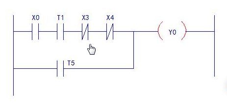 上圖中,XO、T1、X3、X4、T5都可以稱其為YO的條件觸點,先不管T5,對YO的控制,只有當XO(輸入條件)、T1(延時時間到后)觸點接通,X3、X4觸點維持靜態時,YO才具備得電條件。這四個觸點要找出哪個條件不具備,找到故障原因,進而修復。如檢查X0、X3、X4觸點狀態都對,看PLC輸入端子狀態指示燈,X0點亮,而X3、X4熄滅,則四個條件中三個條件都已滿足,只剩下T1條件未能滿足了。進一步在程序查找對T1線圈的控制程序段,再檢查滿足T1得電的條件,一步步深入,找到故障原因。