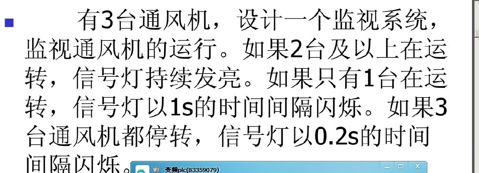 我就不說(shuō)具體的程序了,就說(shuō)一個(gè)編程思路吧,0.00  0.01   0.02  分別代表三個(gè)風(fēng)機(jī)是否運(yùn)行的反饋傳感,如果都為1的話就把一個(gè)輸出信號(hào)燈為1,如果不都為1是其中一個(gè)是0,那么就可以加一個(gè)1s的震蕩,以些類(lèi)推!