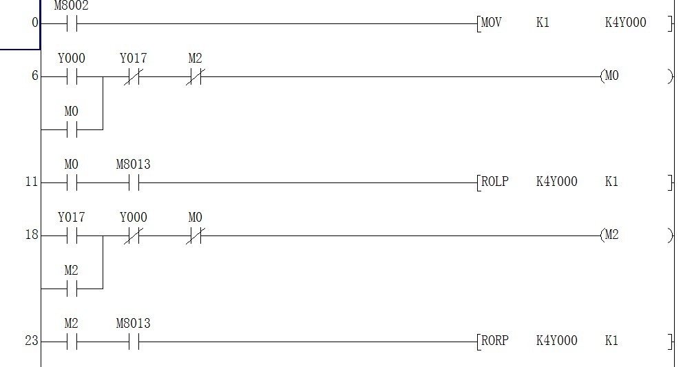 找規律哪,這是16個彩燈左右循環的程序,對與功能指令rol]當目標操作數是位組合元件時,必須是16位或者是32位,假如我想讓15個彩燈左右循環,應該是把Y17改為Y16 ,K4Y0改為K8Y0,或者20個彩燈左右循環,應該是把Y17改為Y23 ,K4Y0改為K8Y0,注意Y為八進制,對你有幫助的話,給我打分,謝謝