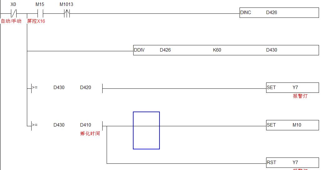 現在這個DINC的指令是不是存儲在高位D427地位D426?然后DDIV指令D426除以K60存儲在D431 430里面?下面的比較是不是D431D430和D421D420比較?