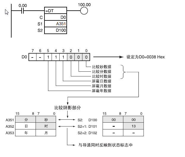 D100中輸入了29,而D101中輸入了1106,控制字選用了7,也就是屏蔽了秒,分,時的比較。