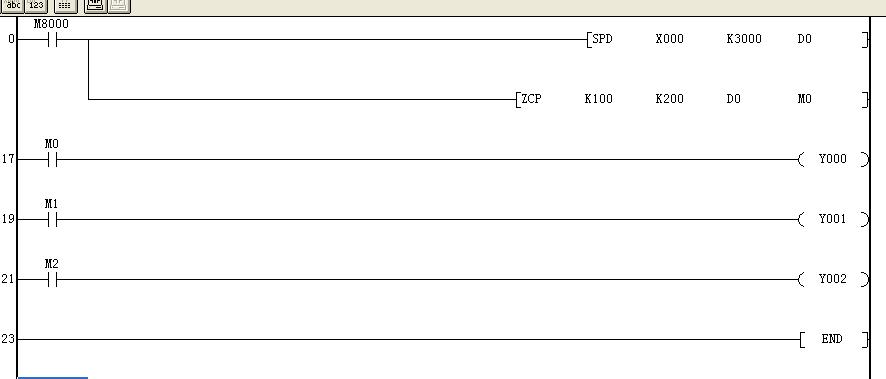 今天買了個單片機式的PLC,供應商說是按三菱FX2N的PLC來使用,當然這個玩藝只能支持FX2N的很少一部分指令,其中說是可支持ZCP指令,可是我試用這段程序,發現D0的值無論是多少,Y2都會一直有吸合的,真是郁悶,看看論壇有沒有用個這種單片機式PLC的朋友,你們的機子也是這個情況嗎?有什么好的解決方法?