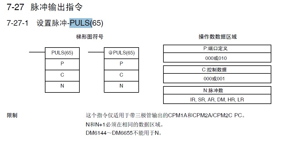 指令的參數設置錯誤:端口指定符可輸入000或010(僅CPM2A/2C支持);控制數據可輸入000或001(僅CPM2A/2C支持);脈沖數需輸入一個字地址(占兩個字),不可輸入常數。