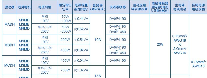 小弟最初的想法和你一樣,原因是當初我選松下A5一個400W的伺服,說明書上寫的400W要配10A的斷路器,不信請看下圖。圖上還寫了接觸器的電流和導線大小。而且還寫了伺服的額定電流是4A左右,不信再請看圖。所以其他的理論我們就不必再浪費口水了,你的伺服肯定也不會相差很大,所以你的總開關至少要2P/20A的,濾波器15~20A,保險16A。至于你的保險會燒,應該是幾個伺服在某一時間同時滿載運行造成的吧。