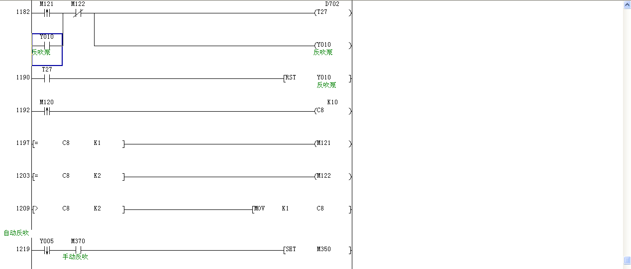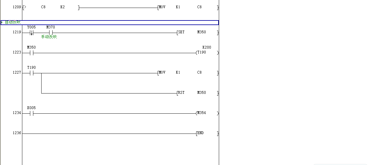 是這樣的,請下載附件后,看1182到1236步,手動M120(為單啟動按鈕),點一下Y10啟動,再點擊下Y10停止(或者延時停止),這個是手動,假如把轉換開關M370打到自動的時候,也就是M370為ON,為什么Y5只有一次從ON到OFF可以正常的Y10啟動,然后延時停止,可第2次Y5從ON到OFF就不可以了呢?Y5作為一個自動啟動的觸發。今天終于看出來了。里面的問題大家看仔細點就看出問題了。