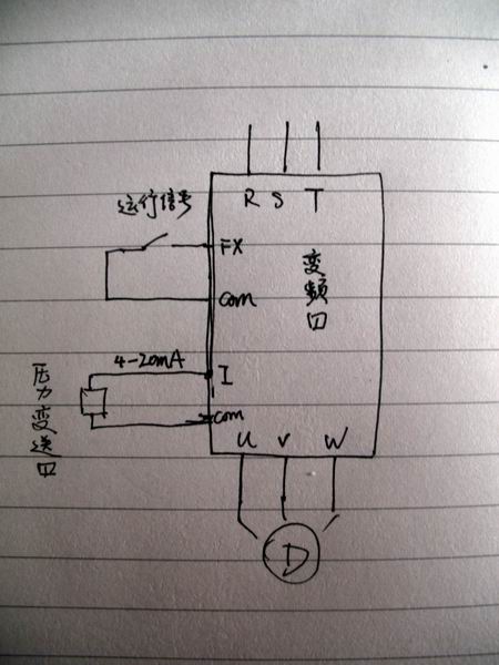 壓力設(shè)定和PID設(shè)定在變頻器選項(xiàng)里設(shè)置,接線就這么簡(jiǎn)單。信號(hào)是4-20mA,也可是電壓,接法接電壓輸入。其他接線省略。