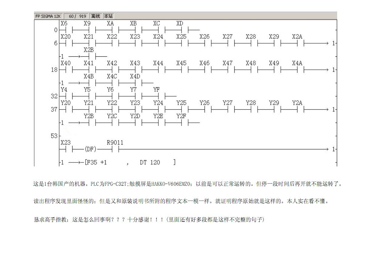 看它怪,這只能說明你沒學過PLC編程.PLC的梯形圖基本都是這樣.你這個梯形圖邏輯與的關系太多.可以簡化程序.機器原先是好的,只是放了一段時間,再使用就有問題.首先你要檢測輸入條件完全嗎?都正確嗎?再看看輸出是否正確?對照設備信號I/O示意圖,監控程序.查看輸出點是否有?看輸入條件信號點是哪個沒滿足.就查哪個外圍輸入開關.你也就會修設備,也知道為啥不啟動的問題點在哪?