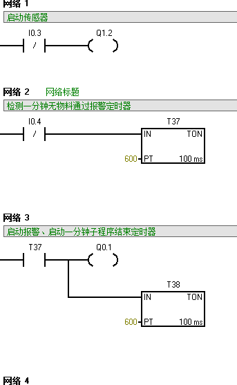持續(xù)一分鐘無(wú)物料通過(guò)則啟動(dòng)報(bào)警器,同時(shí)啟動(dòng)第二個(gè)定時(shí)器,
