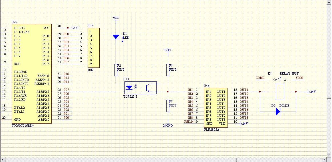 首先我說的是輸入:從構成的回路上看是一組(LED【發光二極管,這里做指示燈用】+光藕的輸入【也是一個LED,是光耦的輸入做光敏三極管的基極信號源,在放大區域內,當輸入LED的電流大小變化,通過光耦輸出可以在光耦輸出端【集電極上反映其電位的高低】+一個限流電阻組成。