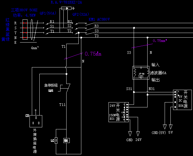 你這圖是單相用電(220V)的,可選用1P+N或2P的漏電短路器。0.75的線,那你的最好選用5A以下的開關(guān),不然就變了大牛拉玩具車。像你的開關(guān)電源就沒必要用了,接條地線就O啦。