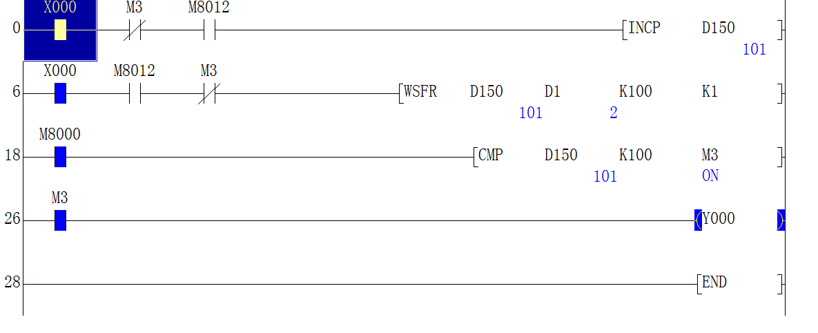 就是這指令  cmp   按程序讀 是當d150 等于100 時 m3 啟動   但我 仿真怎么要到 101時 m3才啟動啊?