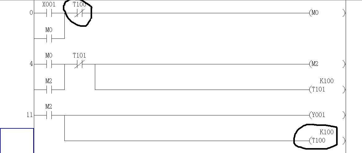 如圖中所示,梯形圖是順序執(zhí)行的,在程序第0行中,有個(gè)時(shí)間繼電器常閉觸點(diǎn)T100,但給T100的時(shí)間賦值是在第11行,所以程序執(zhí)行到第0行的T100時(shí)間繼電器常閉觸點(diǎn)后,是否開(kāi)始計(jì)時(shí)?延時(shí)10秒后T100常閉觸點(diǎn)斷開(kāi)?還是?第0行的T100常閉觸點(diǎn)會(huì)一直閉合,直到遇到給T100賦值的語(yǔ)句?實(shí)在是困惑,求解,萬(wàn)分感謝!!!