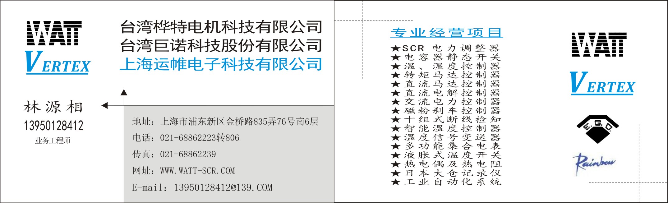 ※主要產品有臺灣樺特WATT電力調整器(SCR)又稱晶閘管可控硅、功率調整器、調功器(W2 W3 W5 M5 WS)系列;※巨諾溫控儀器儀表VERTEX(VT4826 VT7226 VT9626 VT9630等)、傳感器;※臺灣運泰比例連動、變位式捲取、放料控制器;※臺灣儀控溫度控制器TAIE(FY400 FY700 FY900 FA200 FA211等);※并承接工業自動化PLC、HMI、伺服系統設計與信息系統融合;※自動PID溫度控制系統等。