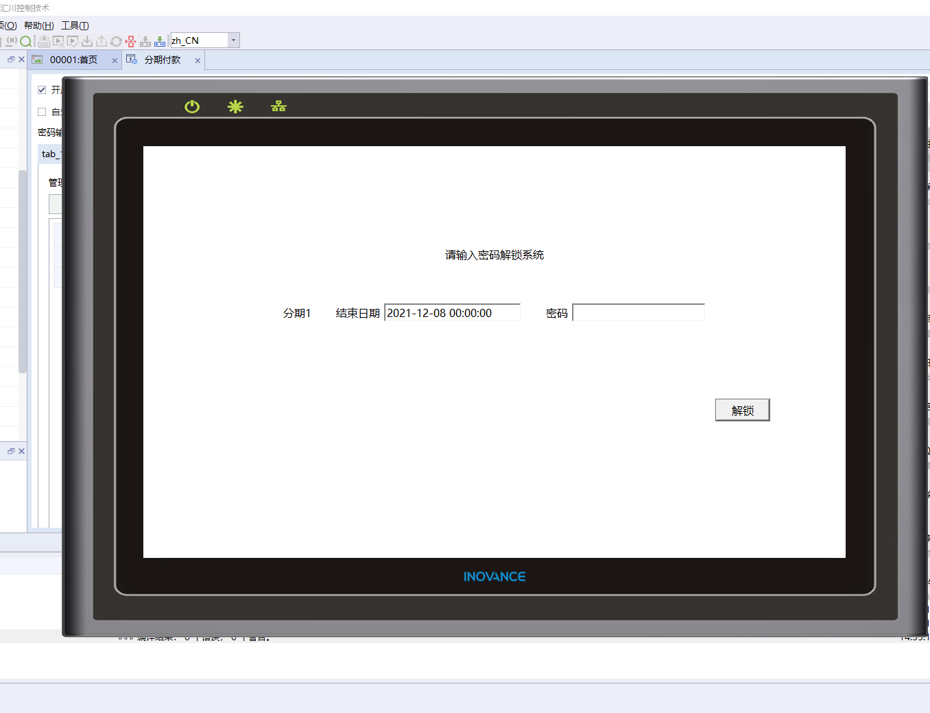 我選擇的使用常量密碼,設置了一個分期日期,2021-12-08 00:00:00,也勾選了開啟,然后下載進入觸摸屏之后,無法彈出解鎖畫面,但是我點擊離線模擬的時候,在模擬畫面里,卻可以彈出解鎖畫面,在實際觸摸屏上就是不行。