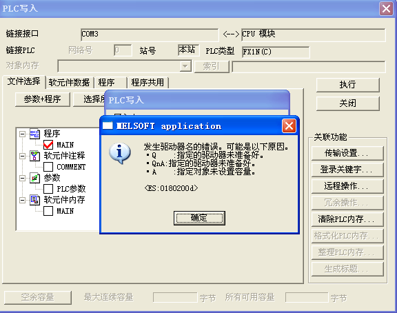 個人認為你的編程軟件有問題,不然咋你傳送的是FX1N,出現的報警是Q, QnA, A 等CPU呢?