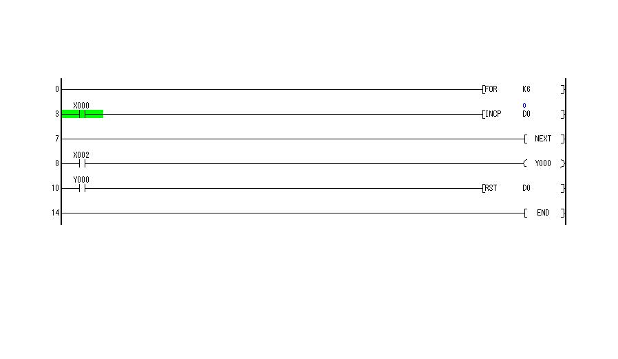 我剛剛寫了個簡單程序,可是FOR 指令的循環次數不變,不能執行NEXT以下的程序,把PLC關掉,把X0,X2都輸入,然后開始監控,Y0還沒輸出,頭疼啊,循環為什么不結束呢