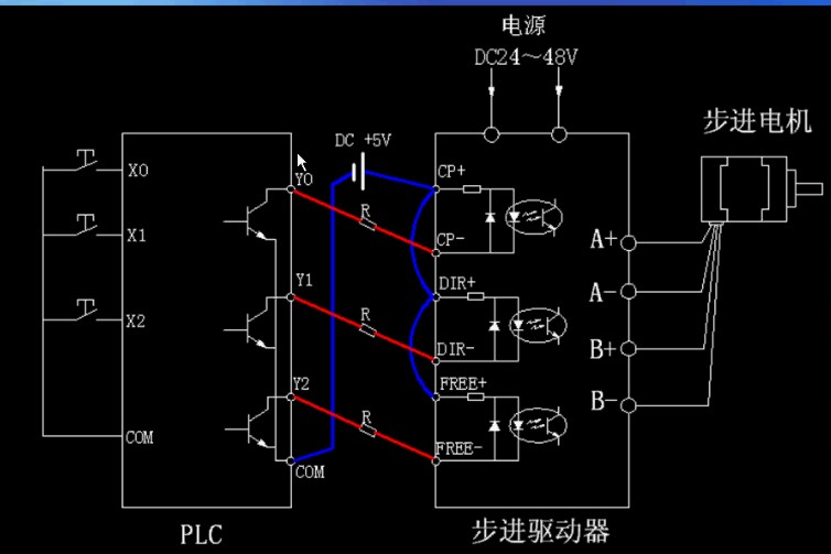 步進電機驅動器控制部分是無源驅動,因此要引入驅動電源,通過PLC的輸出來控制脈沖數量、脈沖方向、脫機信號