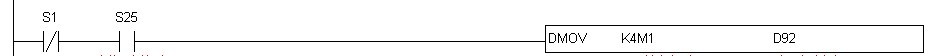 當S1OFF,S25ON時,將M1-M16狀態(tài)傳入D92.D93中。DMOV 32位傳送。
