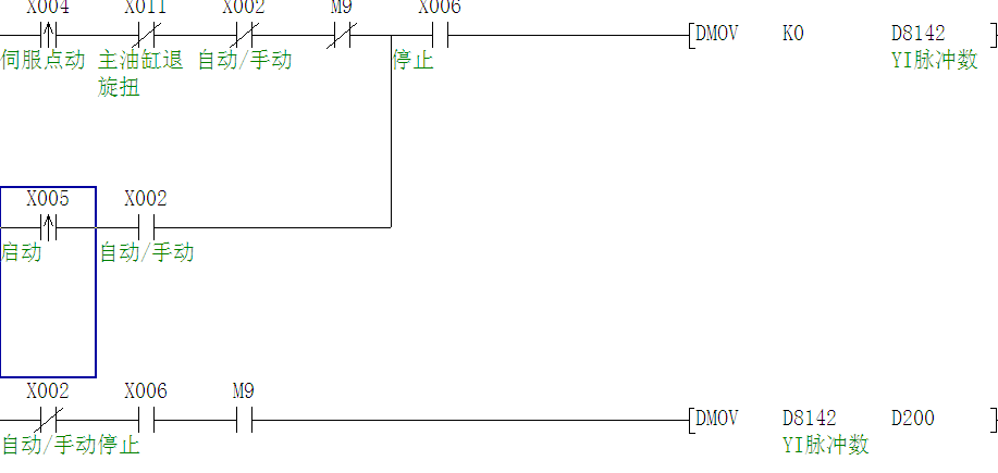 你說的有道理,手動的寄存器清零。點動對y0的脈沖清零一次,然后又按設定的數值依據油缸的位置進行正轉和反轉,復位和點動又是互鎖的關系。總之我讀起來有些別扭吧,我學藝不精哈。再次感謝你的指點。
