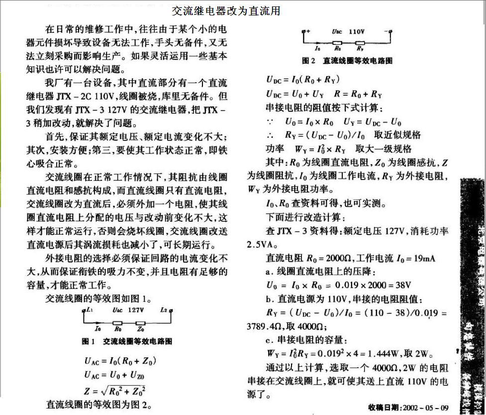 在直流24電源下要想其工作電流為53.8mA,需要的電阻為:24/53.8=446Ω,需要在繼電器上串聯的電阻為:446-180=266Ω。這樣在交流24V繼電器的線圈上串一個200Ω左右的電阻,就可以使交流24V繼電器在直流24的電源下正常工作了。這個我試過,交流24V繼電器串一個200Ω的電阻可以在直流24的電源下正常吸合。