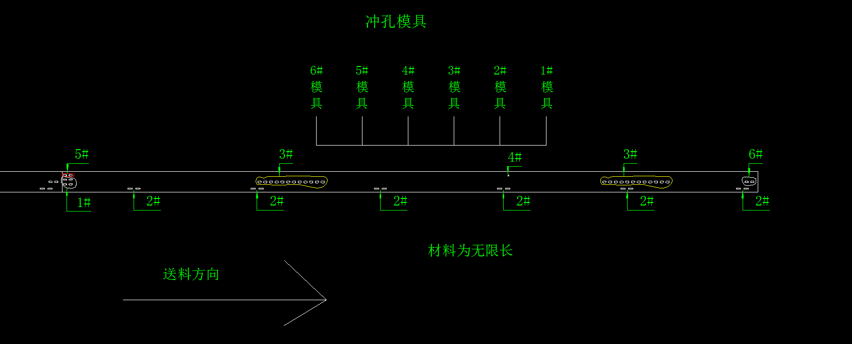 2.上圖為一根材料上的孔位,之后沖孔都是按照?qǐng)D示不斷循環(huán)。但是料尾的孔會(huì)出現(xiàn)下一根材料上沖了多個(gè)孔,才可以沖料尾的孔,這個(gè)程序怎么做判斷處理。