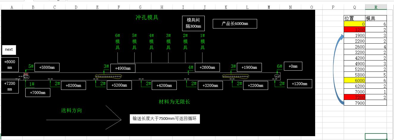 伺服送料沖孔   材料上有6種孔型    6組沖孔模具    沖孔模具之間的間距是300mm   材料為無(wú)限長(zhǎng)    初步考慮是在觸摸屏上輸入  長(zhǎng)度 和對(duì)應(yīng)模具號(hào)   來(lái)執(zhí)行定位
