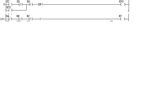 該指令是說RA和RB為off,RC為on,R7為on,還是說只要RA、RB、RC有處于on狀態R7就會為on啊? 任何一個為ON,R7為ON,三個全部是OFF,R7 off 該指令是說XC為on,XD為off或者R72為on,并且R0處于由off變為on的狀態時R70為on,還是說只要輸入元件有一個處于由off變為on的狀態R70就為on 啊。 XC為on,XD為off或者R72為on,并且R0處于由off變為on的狀態時R70為on,是正確的,其它情況不能實現, 建議使用仿真軟件仿真! |