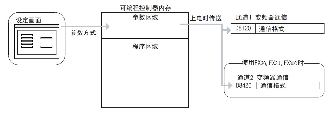 還需要注意的是,在編程時(shí),如果使用CH2,無(wú)協(xié)議通信功能中使用的軟元件與使用CH1時(shí)是不同的。另外,RS2只支持16位處理模式。
