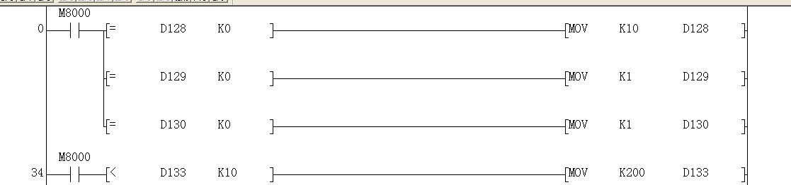 本人認為,上電先把D128  D129  D130等零時,把對應不同值放入寄存器,D133一但大于10,立刻把200放入D133