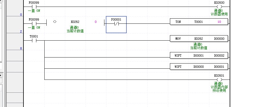 K2600使能高速計數器。。。。。因為有輸入脈沖的原因所以輸入并聯P1的輸入點,作用是P1用來檢測1S內是否有動作。,。。《機器運料比較慢,所以取1S用來檢測空位》    T1工作說明空位了,空位就把數據傳送比較,和復位高速計數器清零等等