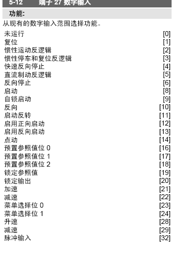 端子27在5-12里設定是16,定義的功能是參考速度0(3-10-0參數里的預制速度設定為10%,也就是5HZ)