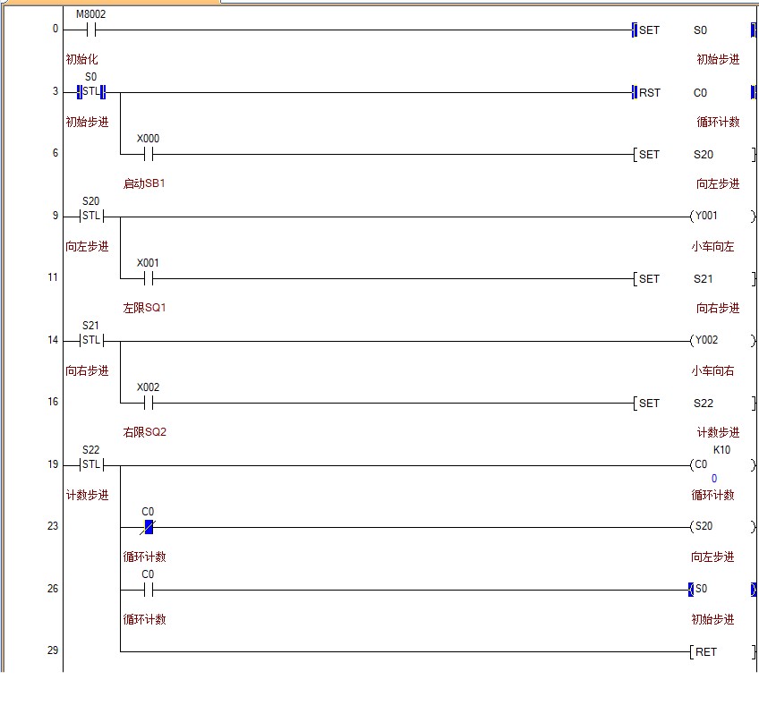 用這種方式,可以完整地看見仿真過程。SFC的編程方式過于繁瑣,不如用梯形圖。