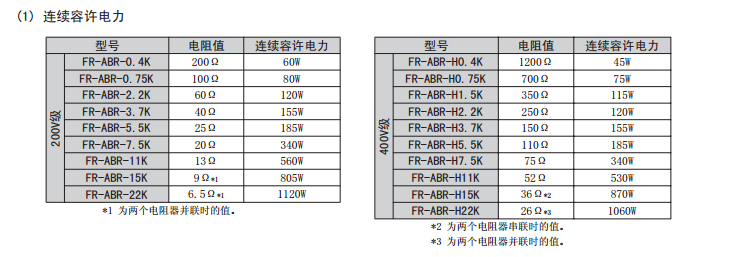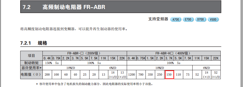 500W200Ω剎車電阻能用于FR-E740-3.7KW變頻器上嗎?說明書沒具體提及剎車電阻的阻值及功率,手頭有個(gè)剎車電阻,不知道能不能用。