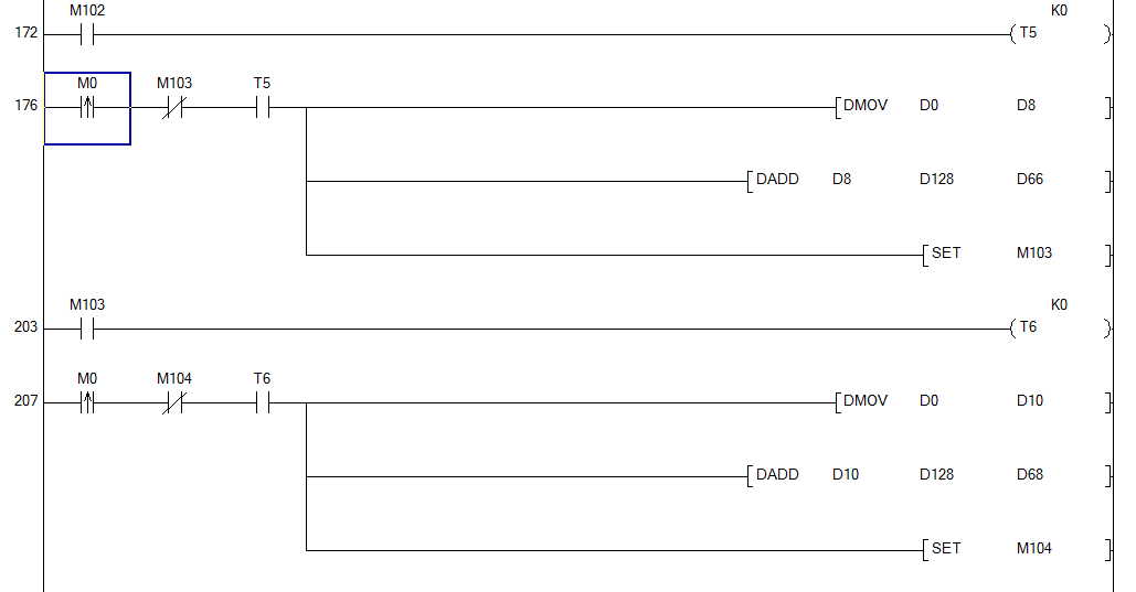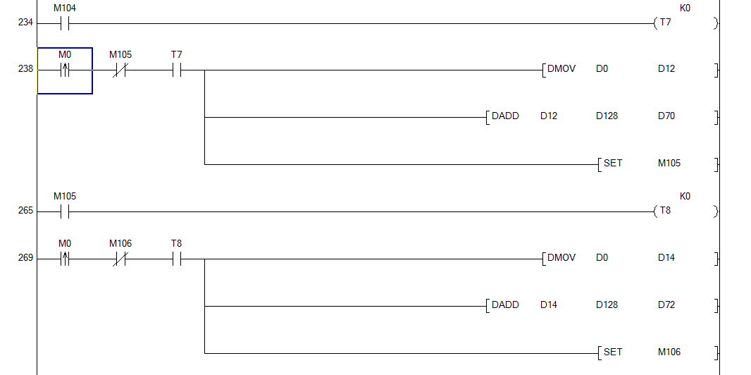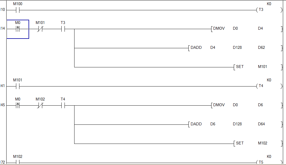 先工藝有兩道工序 ,第二工位受第一工位控制,當第一工位有產品(感應器檢測)延遲一定時間T,到達第二工位,第二道工序動作;目前編寫的程序可以實現,但是第二工位會出現遺漏,程序如下,現考慮用SFTR指令 哪位大神有做過類似的,麻煩給點思路,謝謝!!PLC三菱的