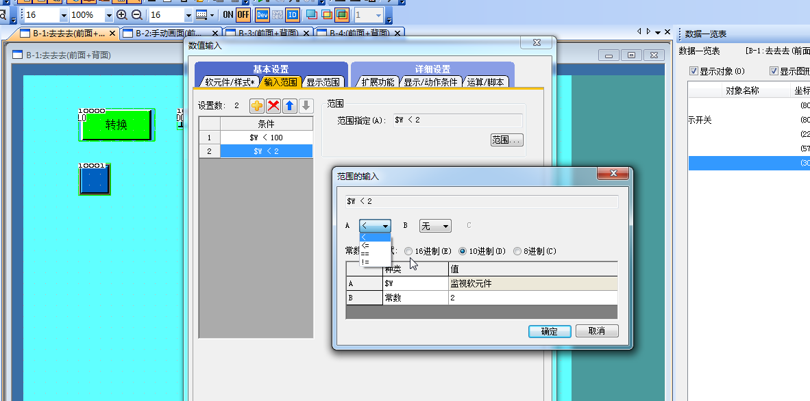 觸摸屏添加一個(gè)數(shù)值輸入  在輸范圍內(nèi) 選擇范圍符號(hào)  怎么沒有大于號(hào)  或者大于等于號(hào)