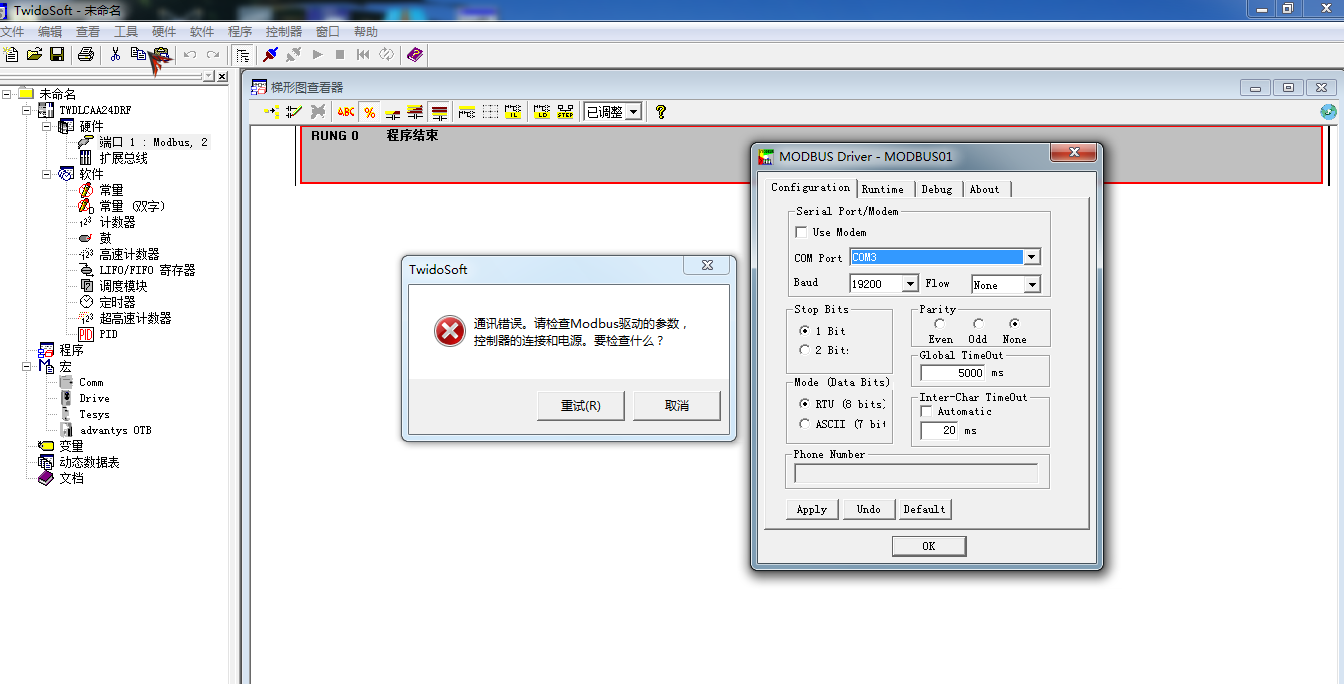 施耐德PLC,型號為TWDLCAA24DRF,連接電腦時出現如圖所示的問題,請各位高手指點迷津!!!!!