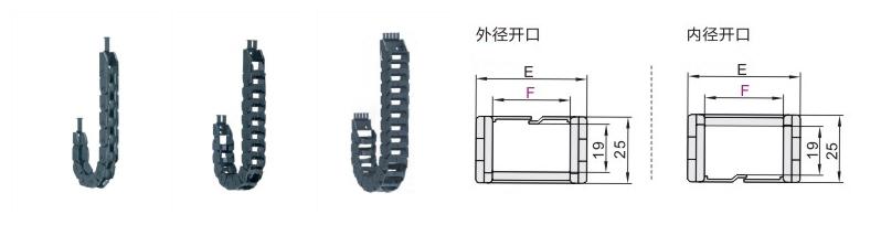 4.打開方式:拖鏈橫桿是否可開啟的結構方便管線填裝(不可打開、內徑開口、外徑開口、內外徑開口)。
