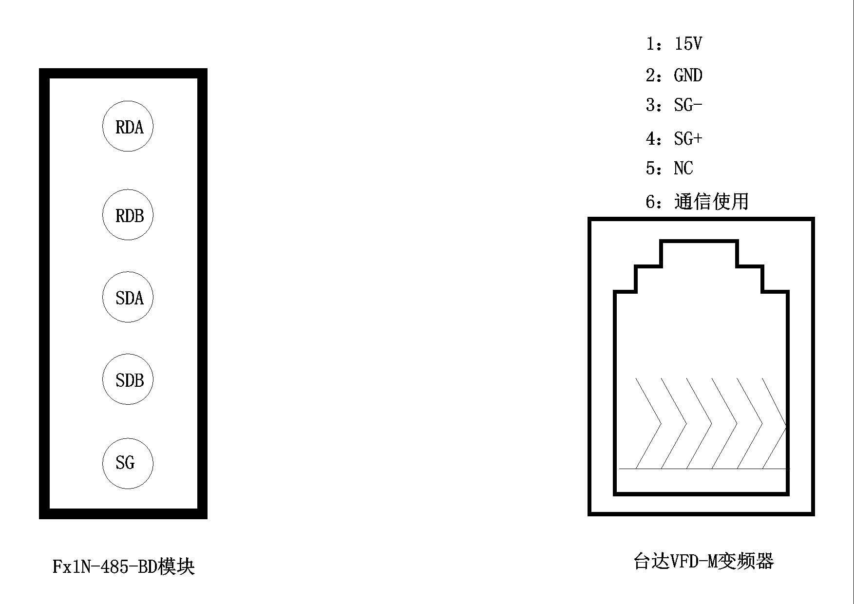臺達VFD-M PU插口和Fx1N-485-BD模塊怎樣對應接線。