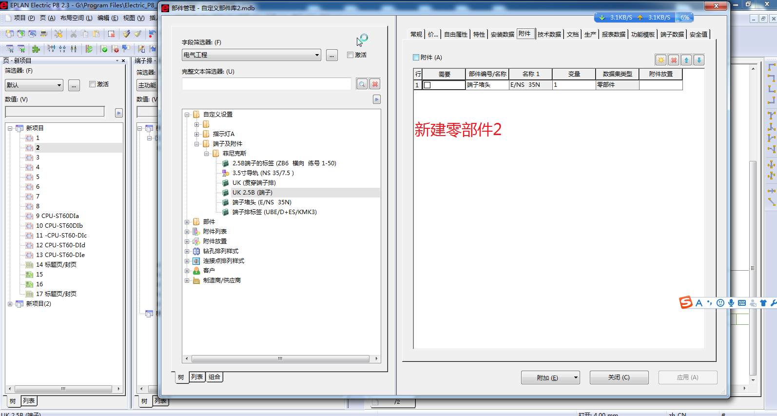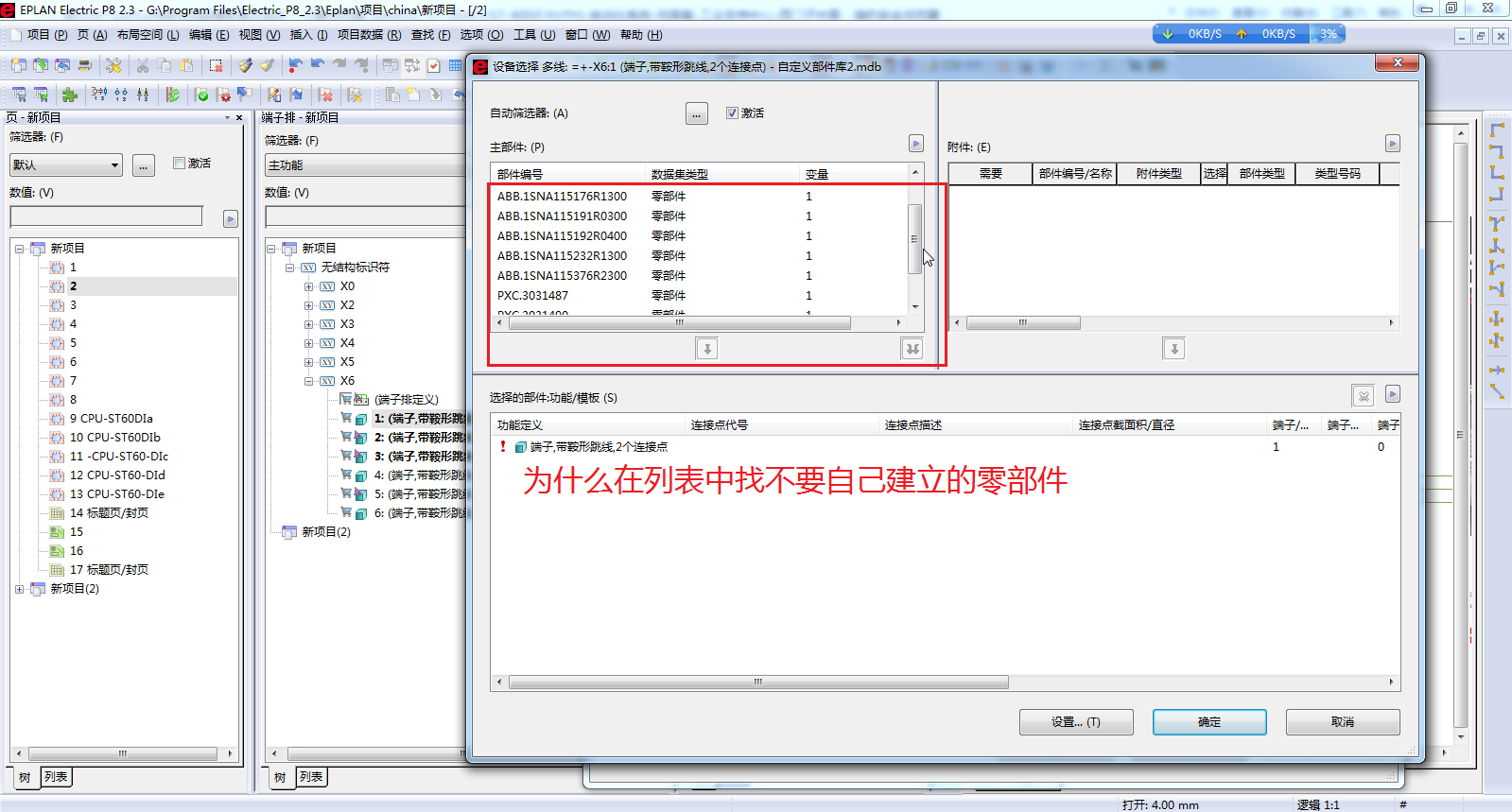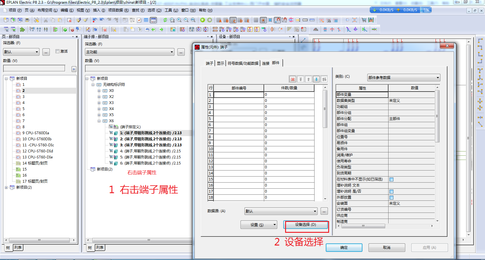 部件里面默認是我建立的端子部件,我刪除它(因為我新建的端子有一些其他的附件,比如堵頭,我想在設備選擇中選擇部件的附件)