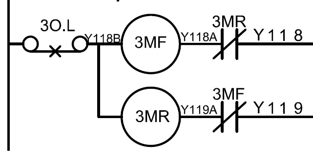 這是線路互鎖 利用MC的B接點 當MC1動作時 MC1 B接點斷開 MC2就無法激磁,反之也是一樣 還有一種是機械互鎖 這是接觸器的一個配件當一邊激磁吸下去 另一邊的電磁鐵就會被頂住無法吸下去 |