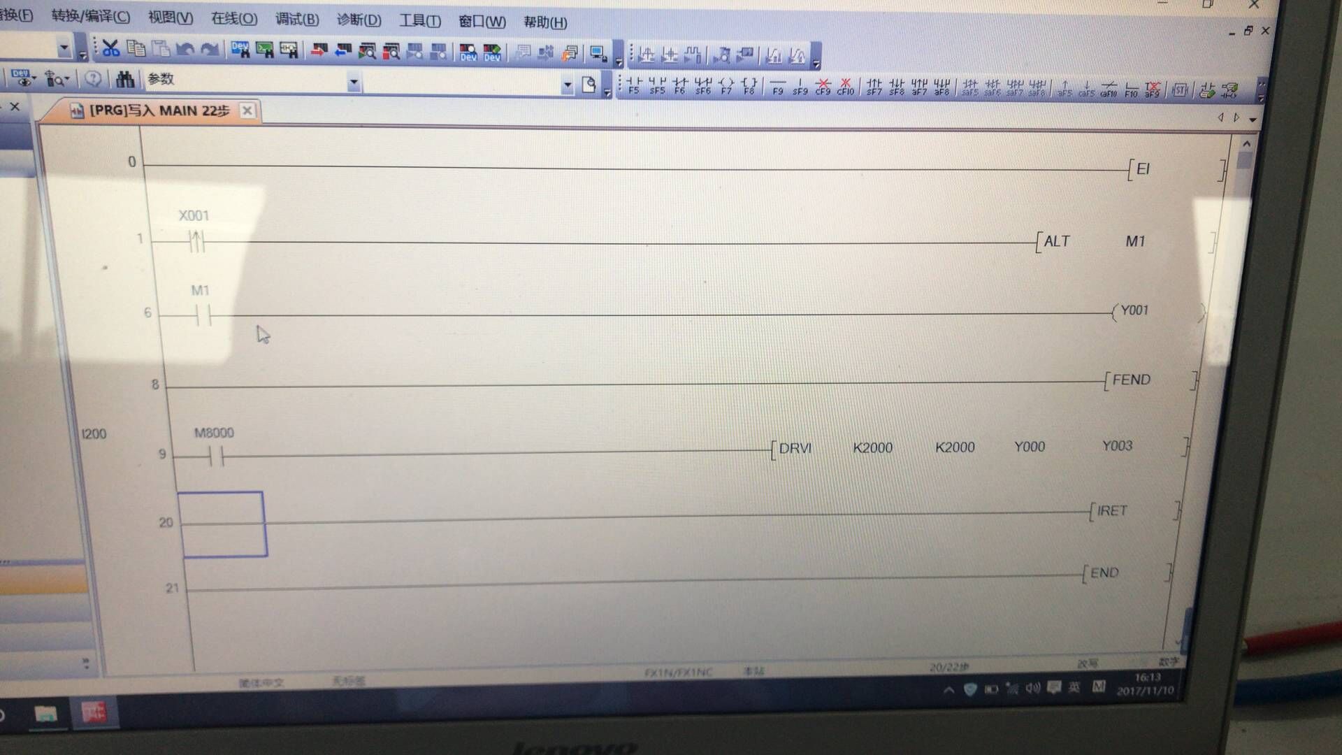 Y1是個三相異步電動機垂直的放,上面一個偏心輪帶著刀上下動。Y0是個步進電機,水平的移動要控制這個電機在刀下來的時候不動,刀上去時才動一毫米。X1是啟動,X2是一個感應器在刀離開水平面是就亮一下。這個三相異步電機速度是每分鐘3000轉。小弟在公司里要改個小東西,希望幫忙。