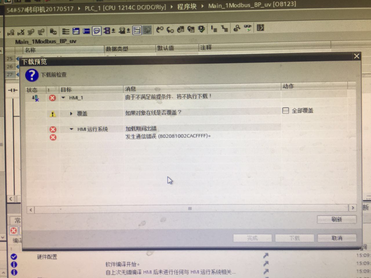 西門子KTP700 Basic PN觸摸屏下載問題:編譯沒問題,到了下載前檢查這一步就出錯了,提示通信錯誤(802081002CACFFFF)如圖所示,各位大佬幫幫忙,支支招吧。感謝🙏