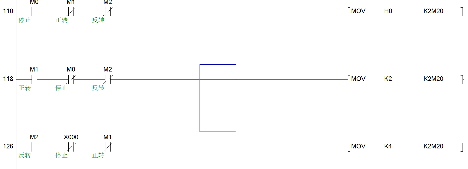 請教各位大神,我用MCGS、FX3U通過PU口利用變頻器通信(485)控制E740變頻器,出現(xiàn)一個問題。我用m0連接停止按鈕,m1連接正轉(zhuǎn)按鈕、m2連接反轉(zhuǎn)按鈕,發(fā)現(xiàn)在觸摸屏上按正轉(zhuǎn)按鈕和反轉(zhuǎn)按鈕都可以控制,但停止按鈕按下沒有反應,電動機并沒有停止。我以為是程序有問題,于是用x0代替了m0,外接一個實體按鈕就可以停止電動機了。其他功能都很正常,都可以通過觸摸屏控制,包括設置頻率,讀出變頻器電壓電流并顯示在觸摸屏上都可以實現(xiàn)。后來我設置了m6和m7做頻率增加和頻率減小按鈕,都不行,將m6和m7換成x6和x7就可以了。百思不得其解,請各位大神賜教。謝謝。