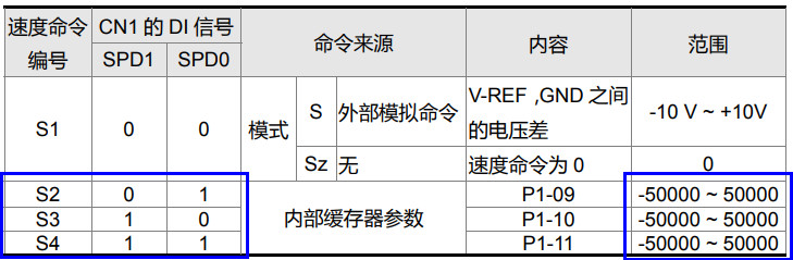 P1-09~P1-11是透過(guò)兩個(gè)INPUT的組合去實(shí)現(xiàn)內(nèi)部命令速度模式運(yùn)轉(zhuǎn)